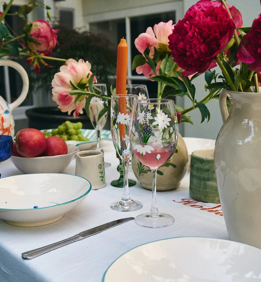De Springtime Toast Champagne Flute Set of 2 is een feestelijke ode aan het voorjaar. Dit handgeschilderde glas is versierd met speelse bloemen en vrolijke bijen, alsof de lente zelf een toost uitbrengt. Perfect voor sprankelende momenten, van een zonnige brunch tot een zomerse avond in de tuin.